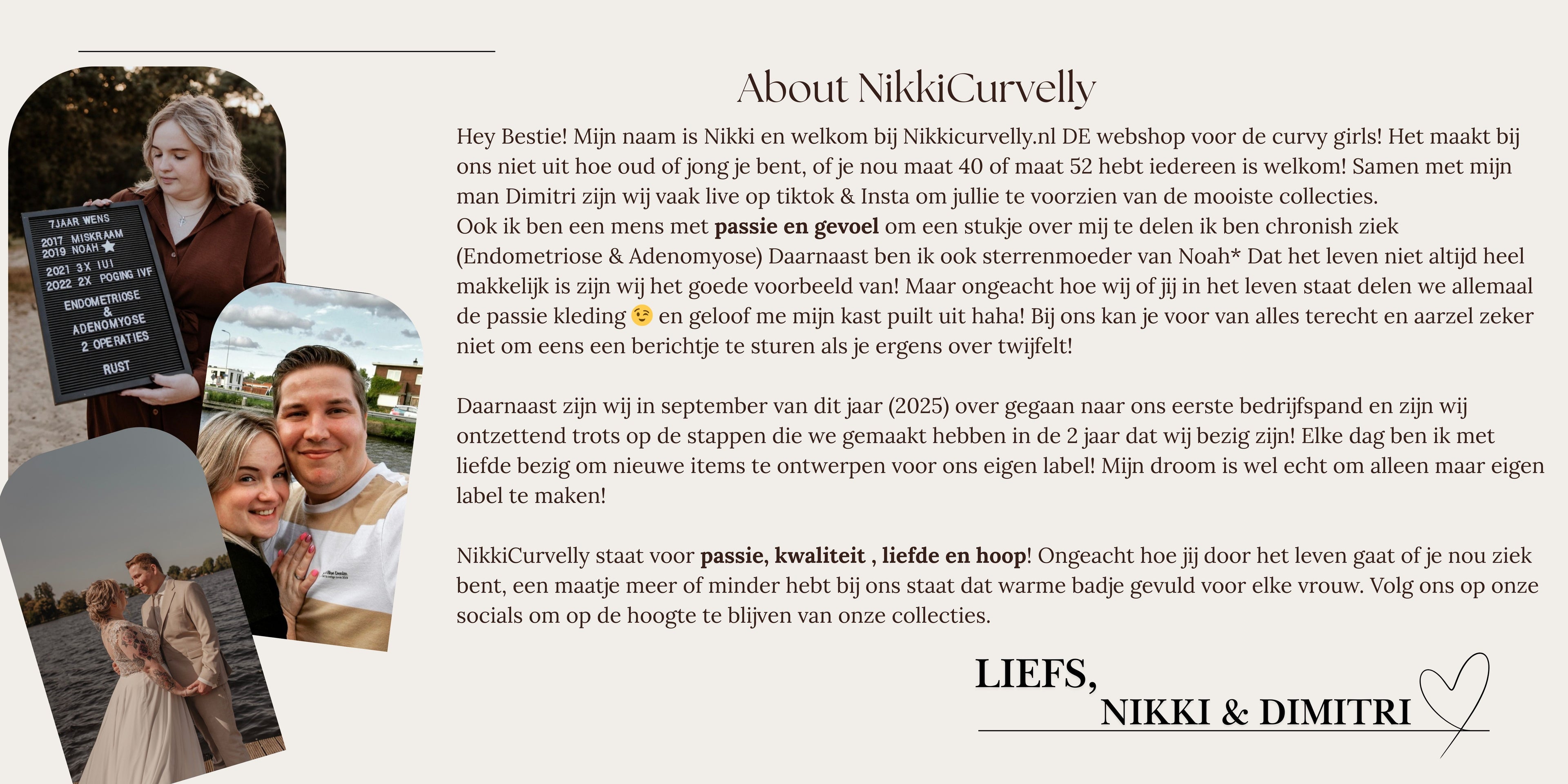 Al meerdere aankopen gedaan bij Nikki Curvelly, zowel via de webshop als tijdens de live verkopen op Instagram en Tiktok & altijd meer dan tevreden! Leuke , moderne kleding van hele goede kwaliteit voor de vrouw met echte vrouwelijke rondingen en een maatje meer. Alles kan & mag bij Nikki en haar man; je pakketje mag zelfs blijven liggen zodat je in de volgende live je bestellingen kan laten toevoegen. Zelfs de verzendkosten worden vergoed wanneer je boven een bepaald bedrag besteld .Nooit iets retour gestuurd, maar ook dat is geen probleem bij Nikki Curvelly. Ik kom hier zeker vaker shoppen & zal het iedereen aanraden. - Nancy van der kamp