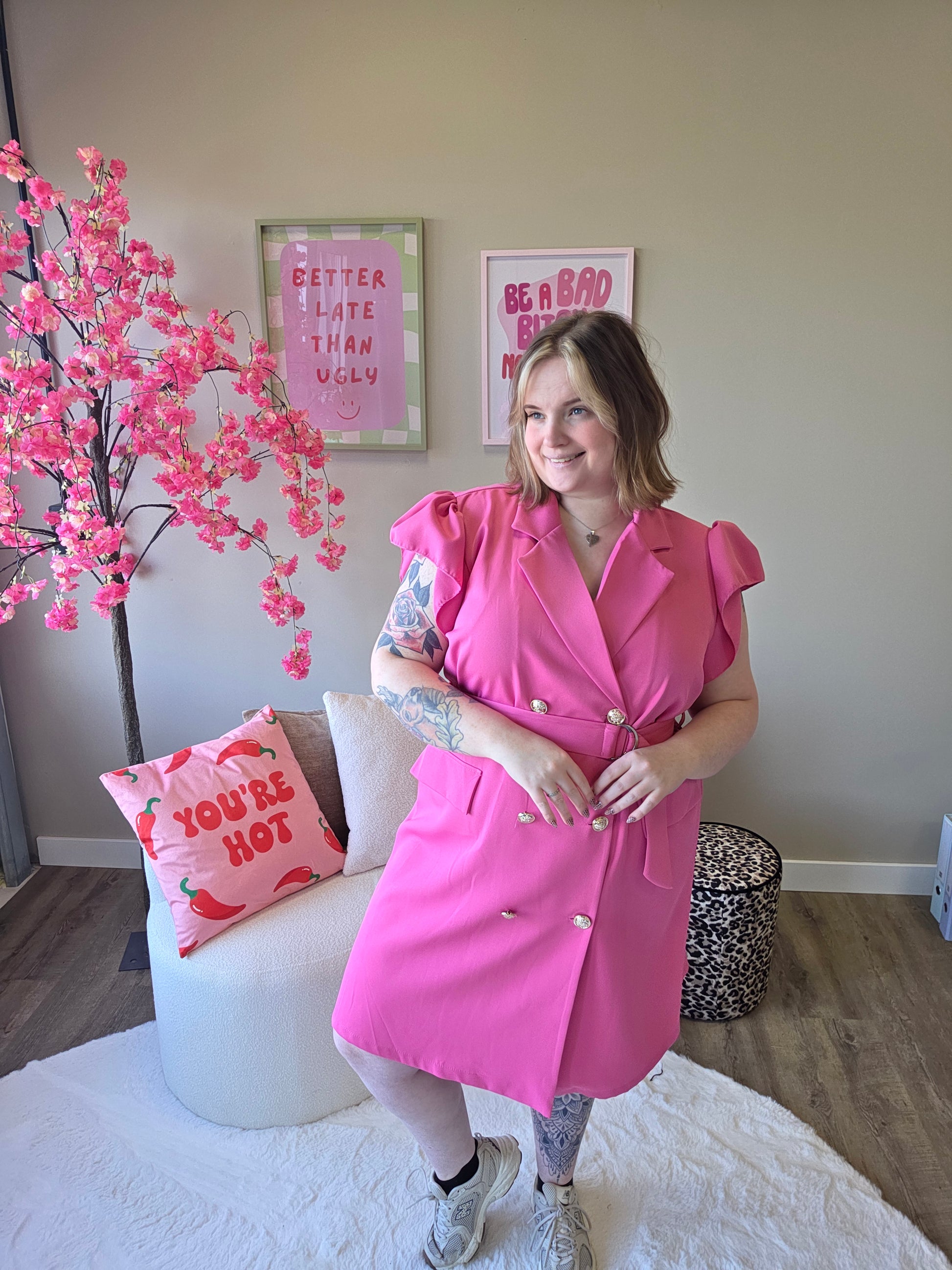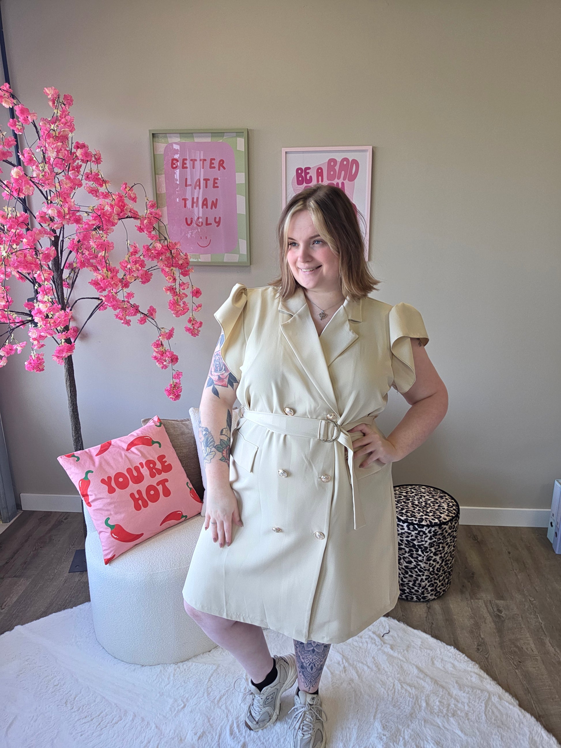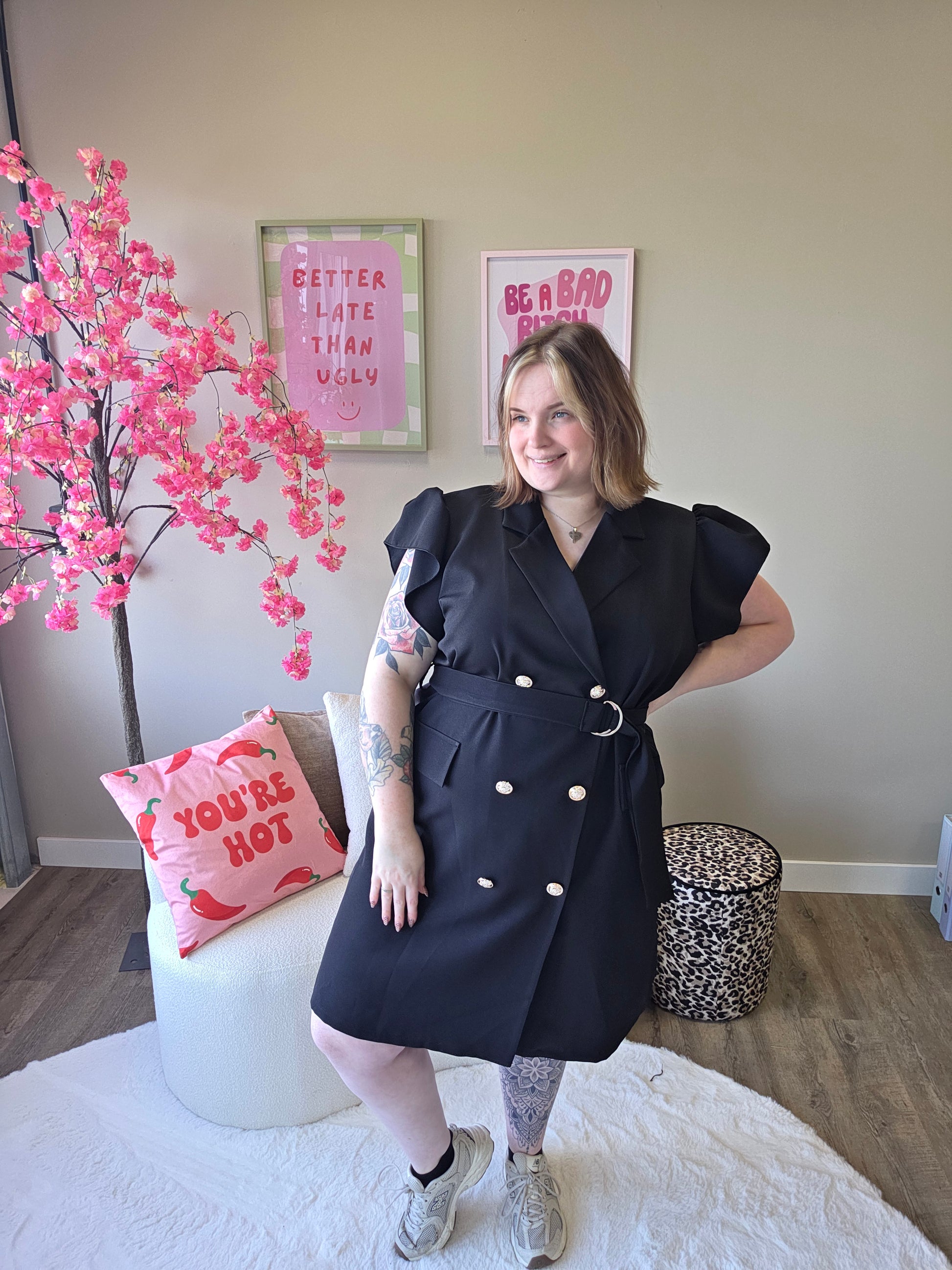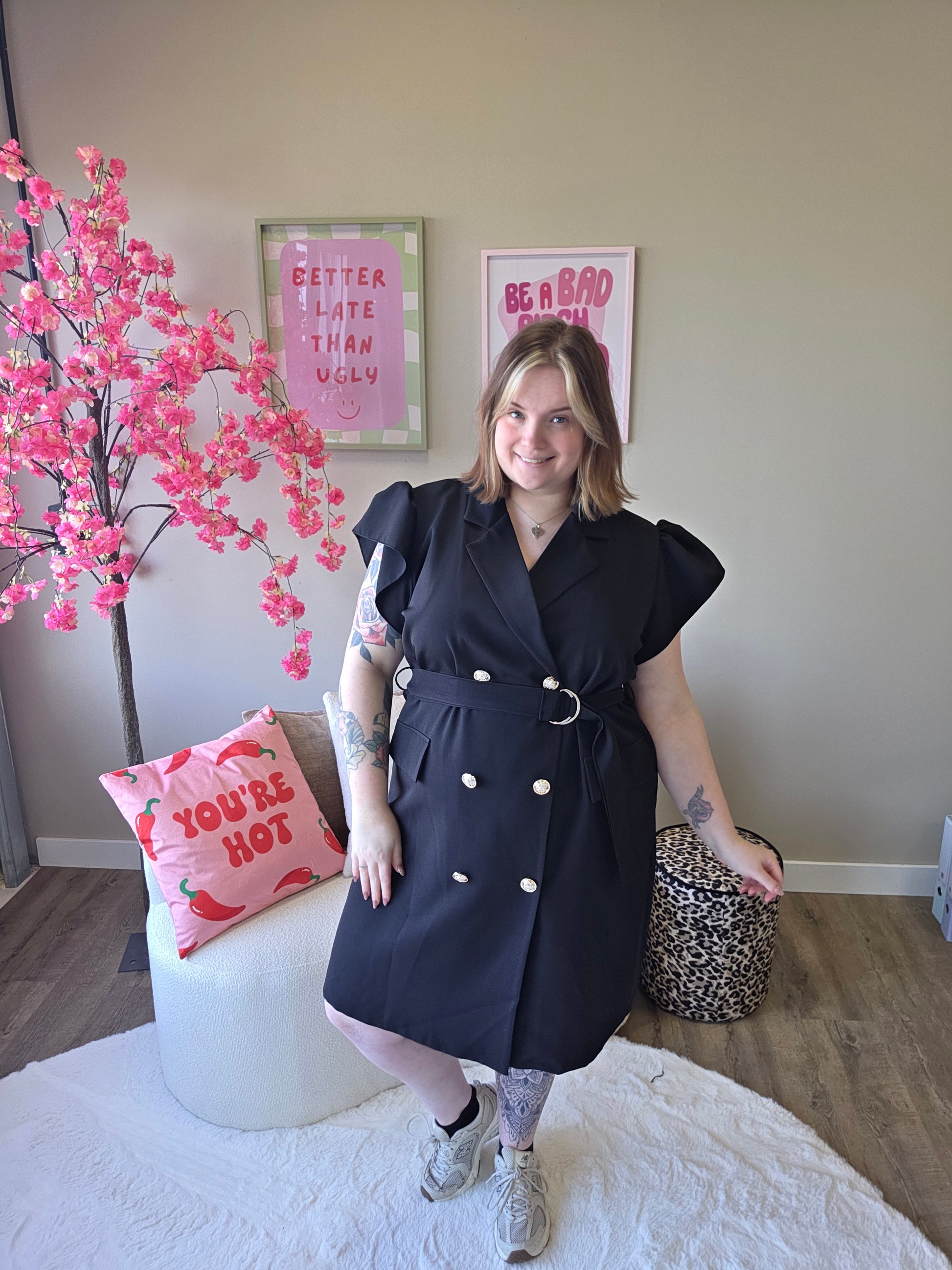 Deze blazer roezel jurk combineert het beste van twee werelden: de krachtige uitstraling van een blazer en de speelse charme van roezels. Het resultaat? Een unieke, vrouwelijke look met een edgy twist.