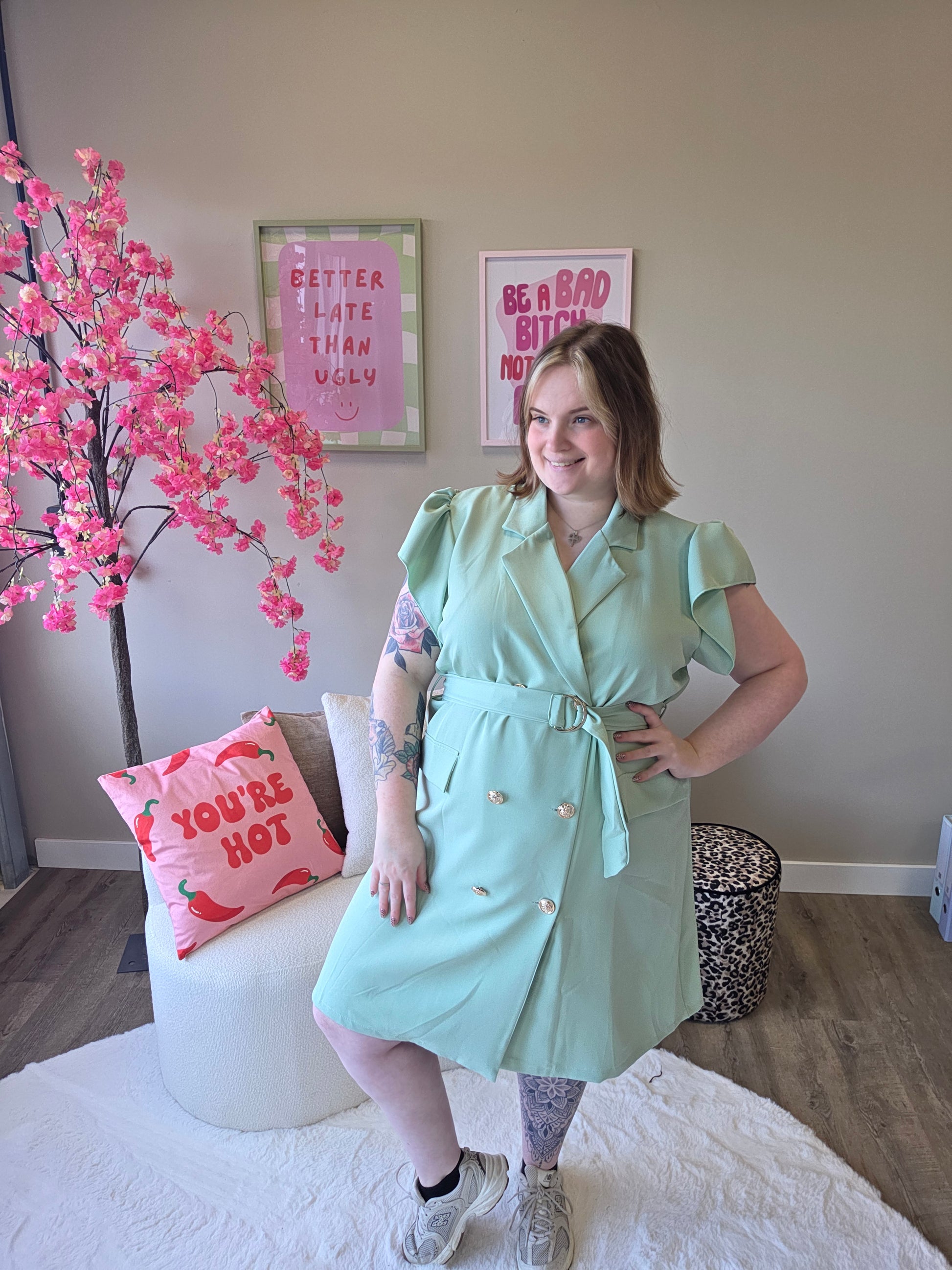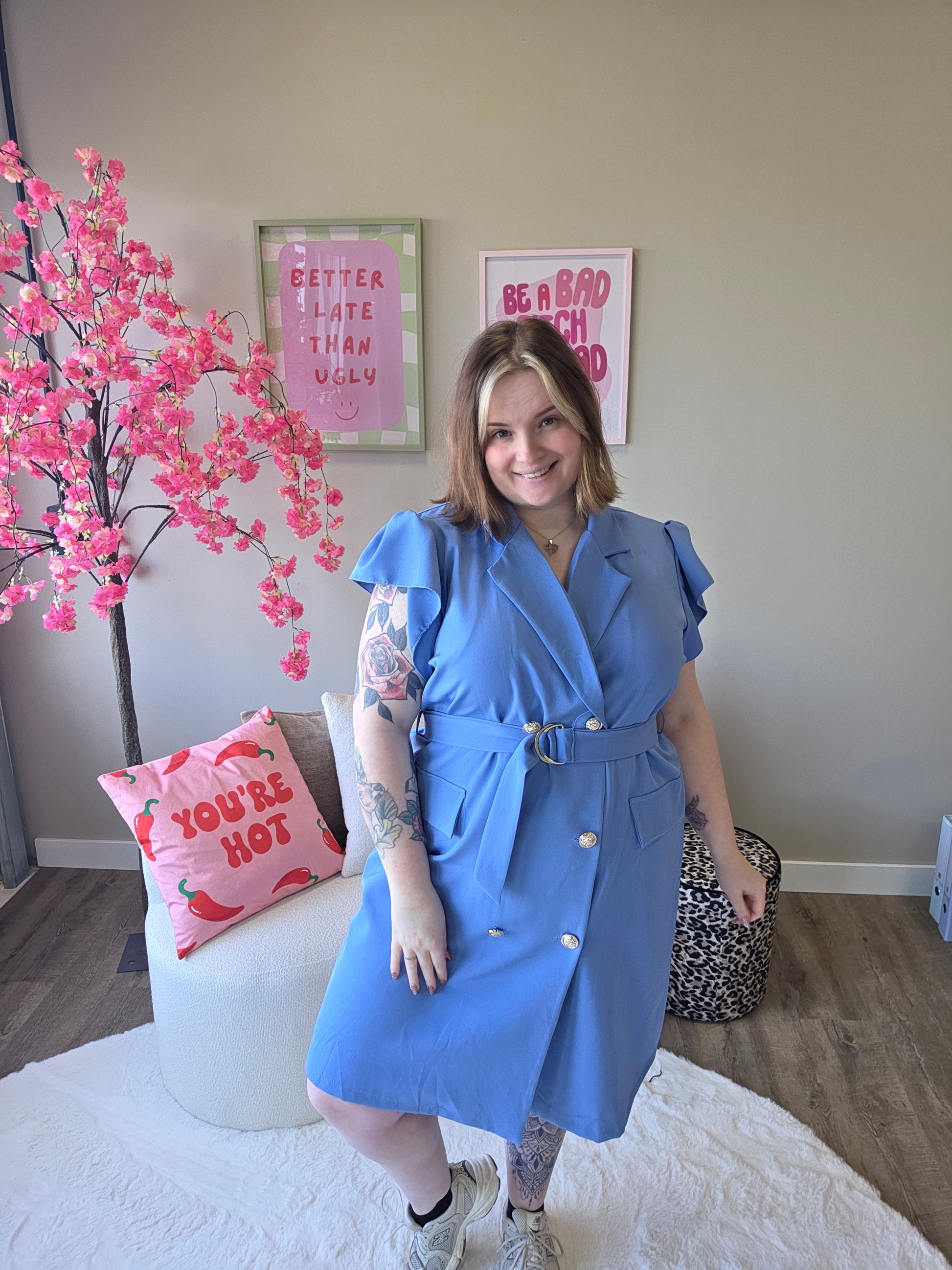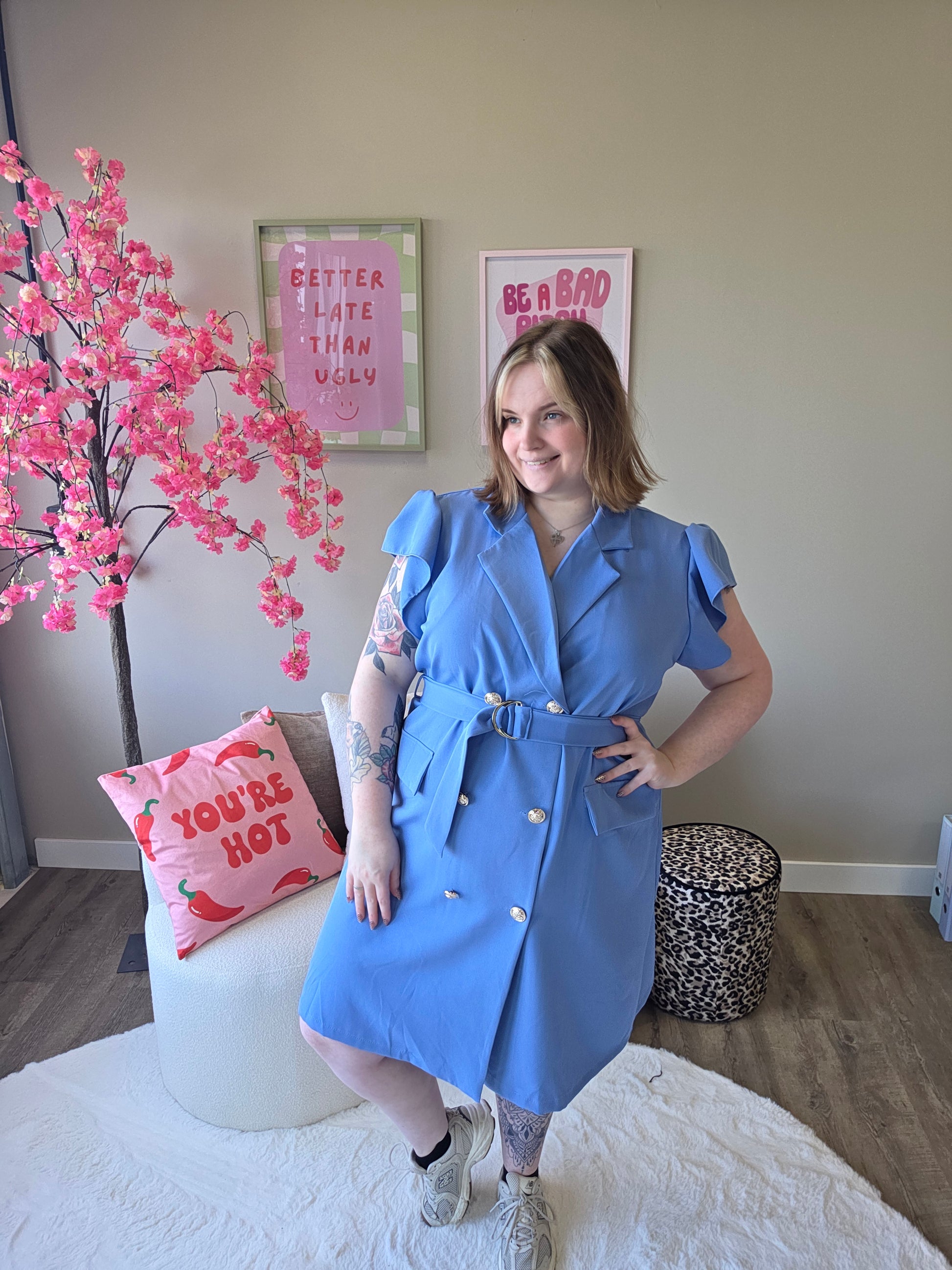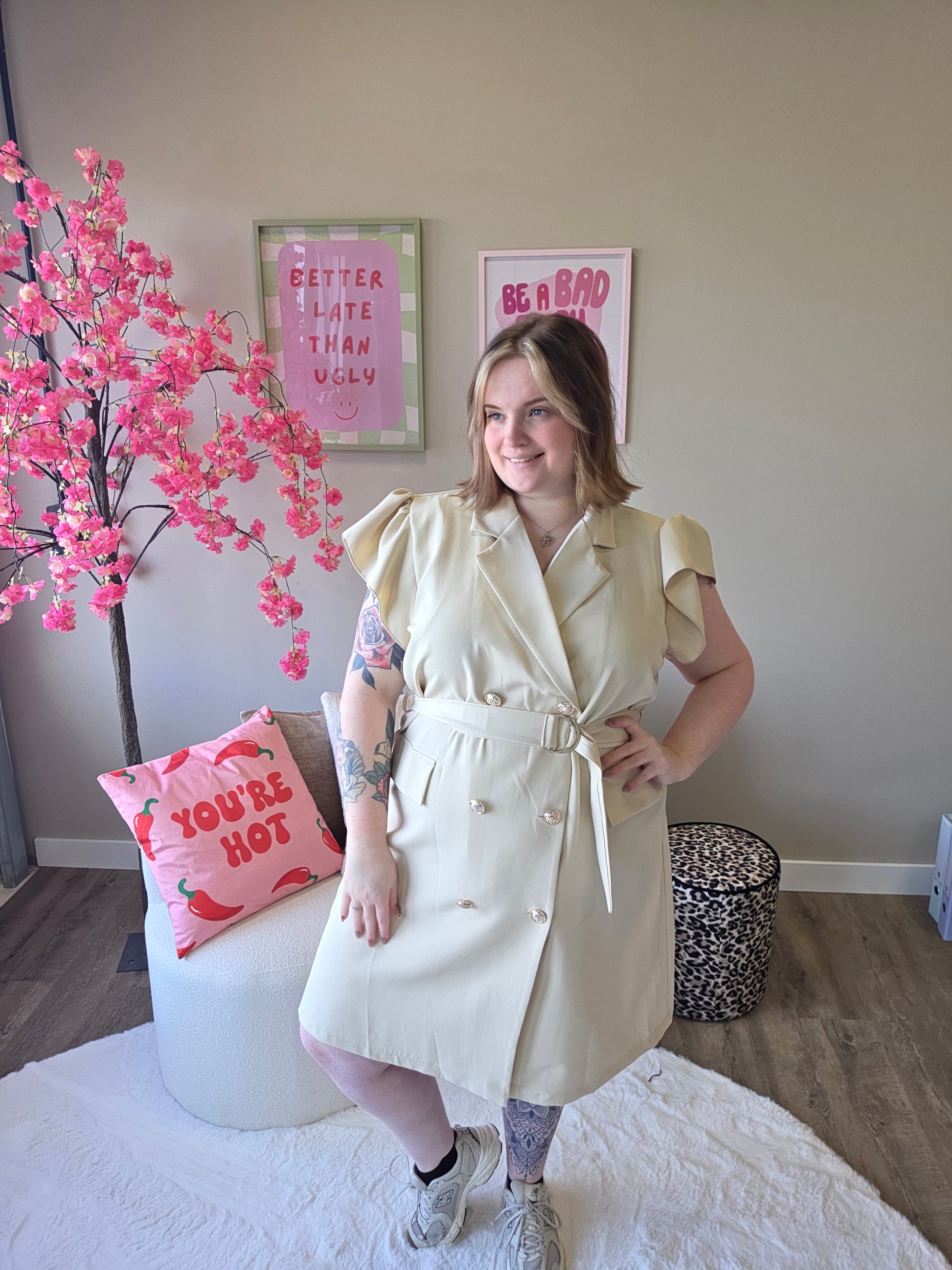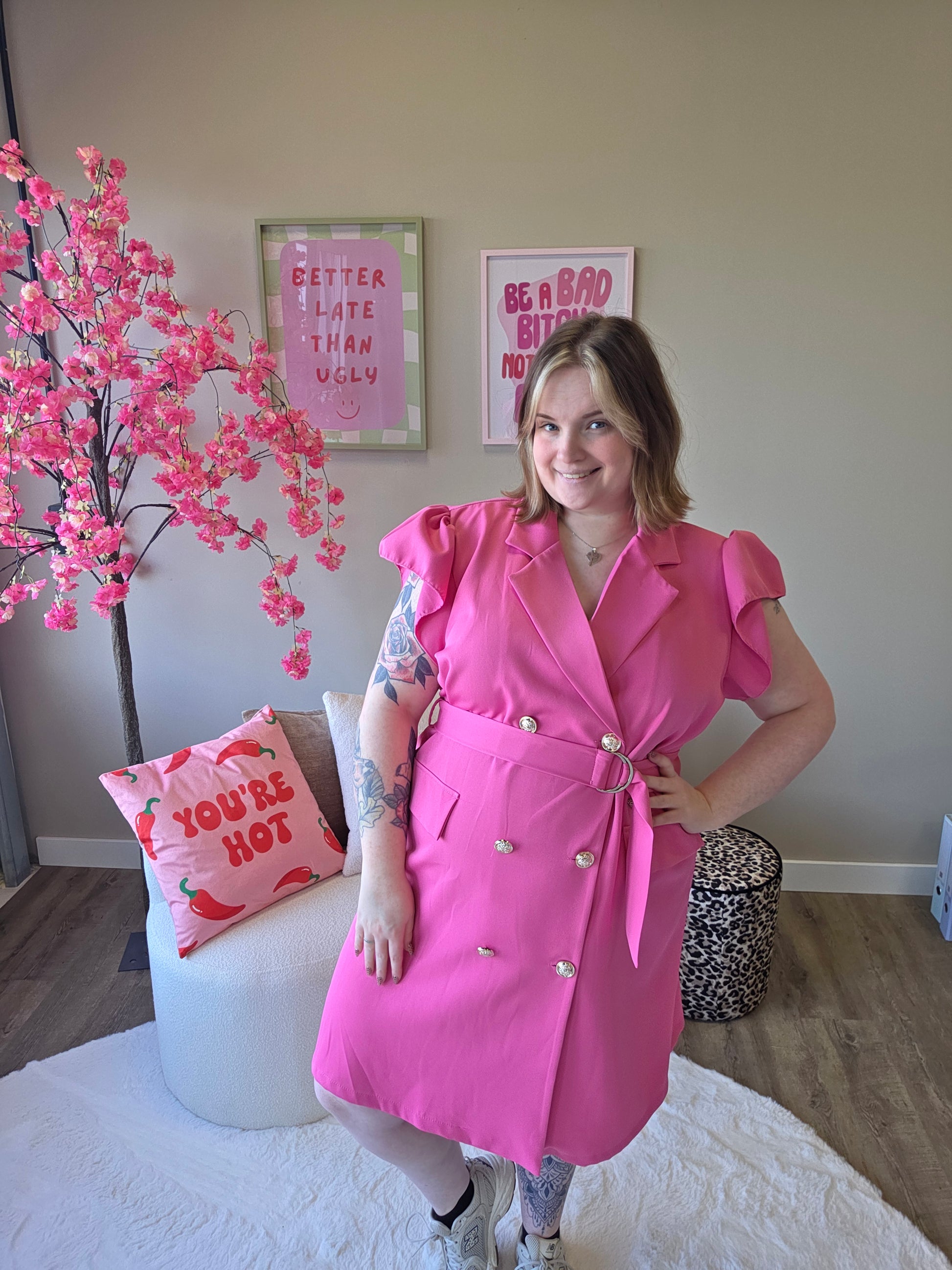 Deze blazer roezel jurk combineert het beste van twee werelden: de krachtige uitstraling van een blazer en de speelse charme van roezels. Het resultaat? Een unieke, vrouwelijke look met een edgy twist.