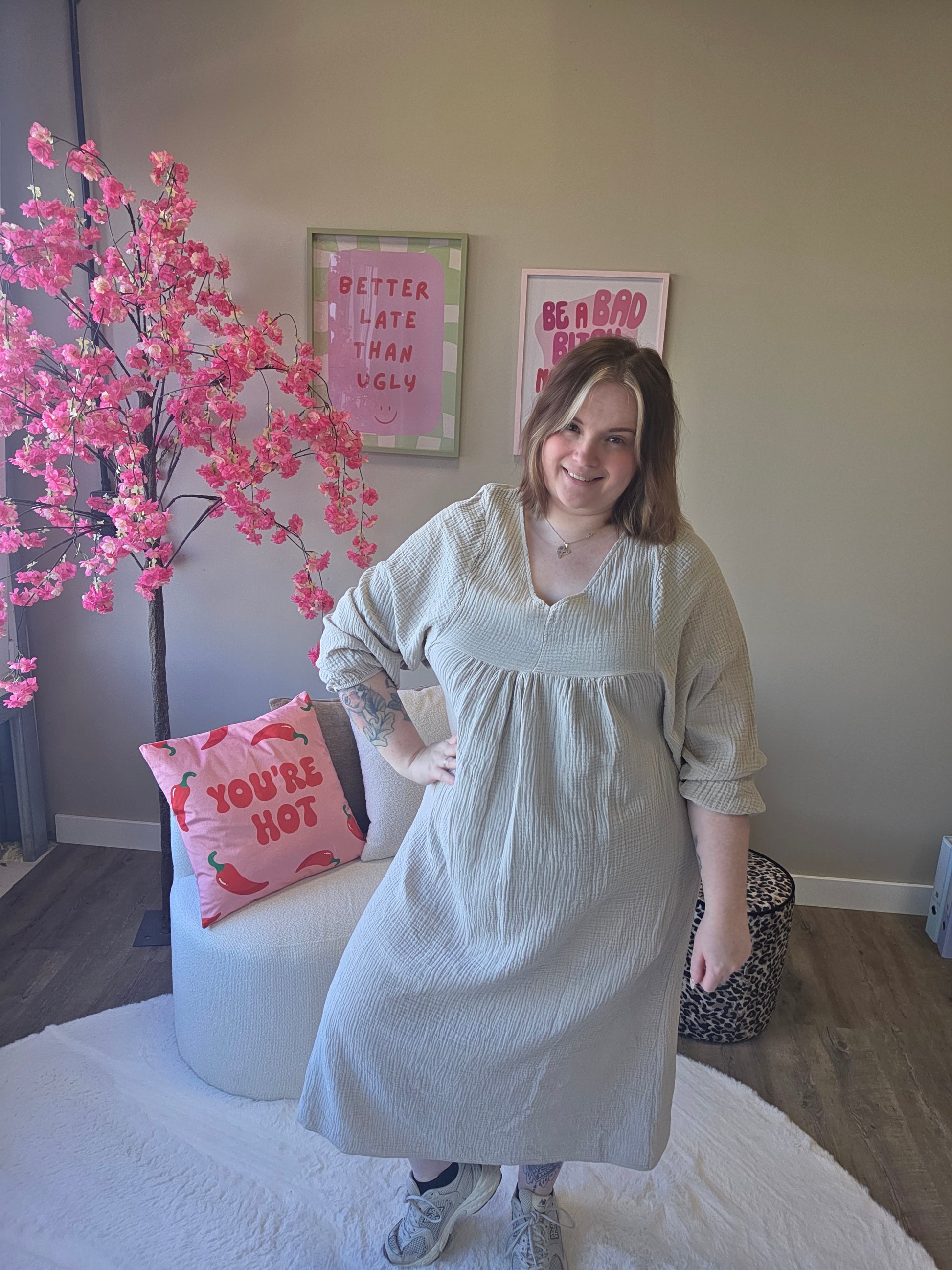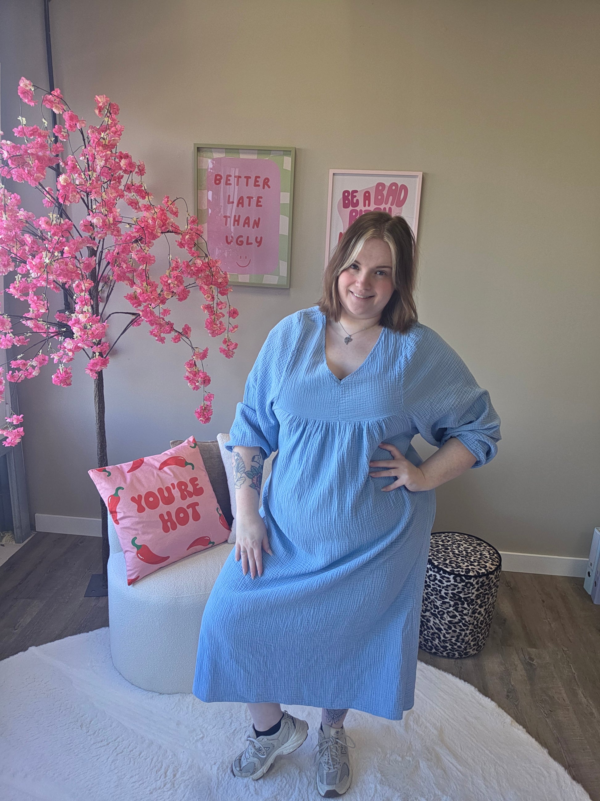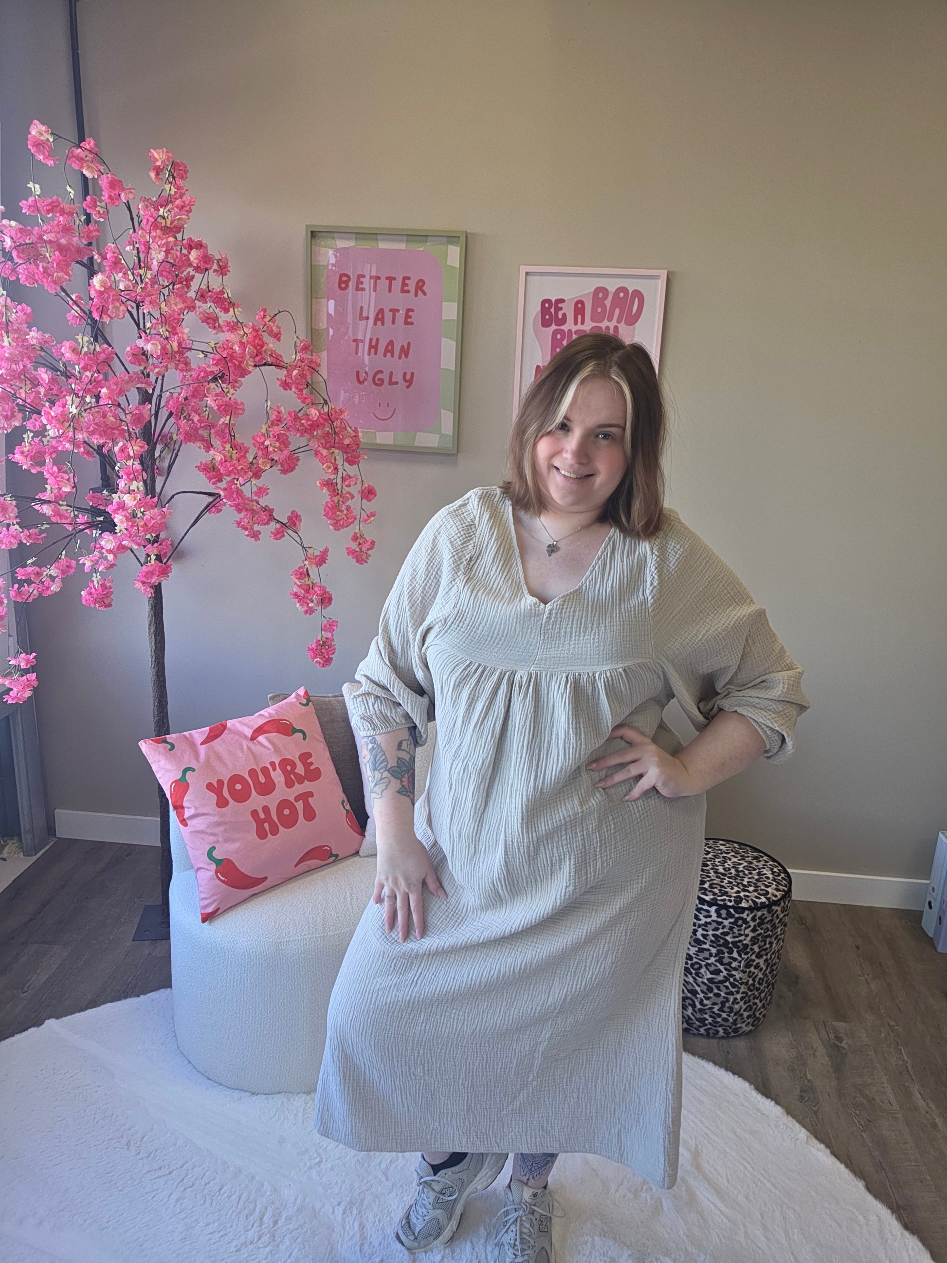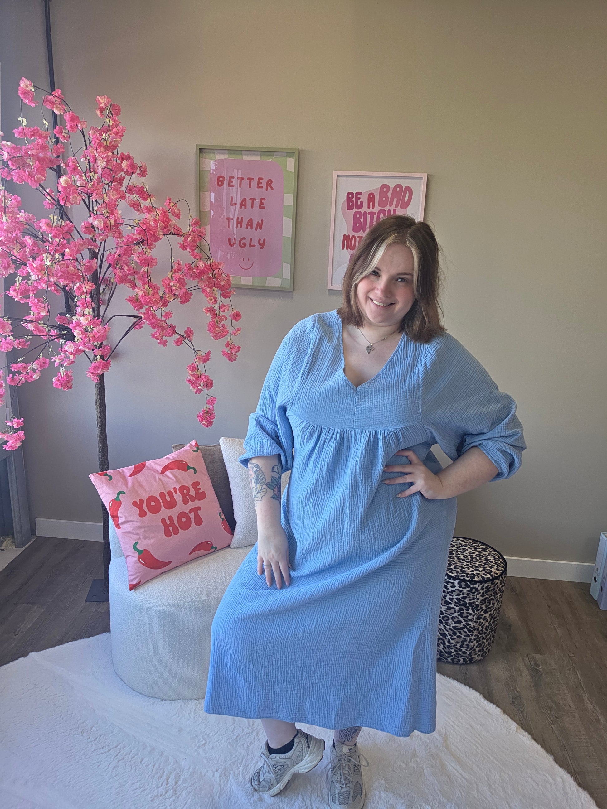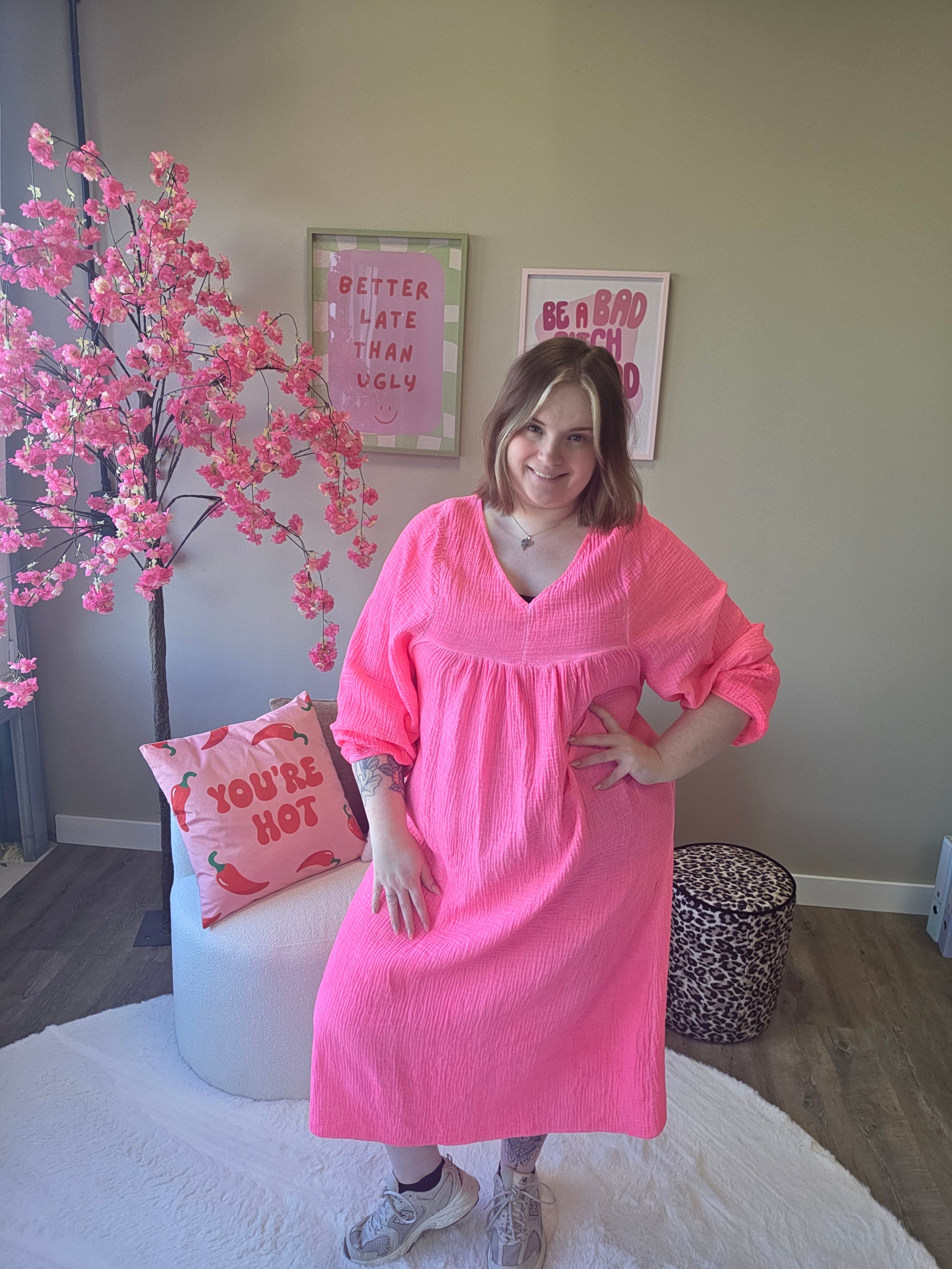Deze katoenen V-hals jurk is jouw perfecte go-to voor een stijlvolle en relaxte look. De V-hals zorgt voor een mooie, vrouwelijke uitstraling, terwijl het 100% katoenen materiaal heerlijk luchtig en zacht aanvoelt.
