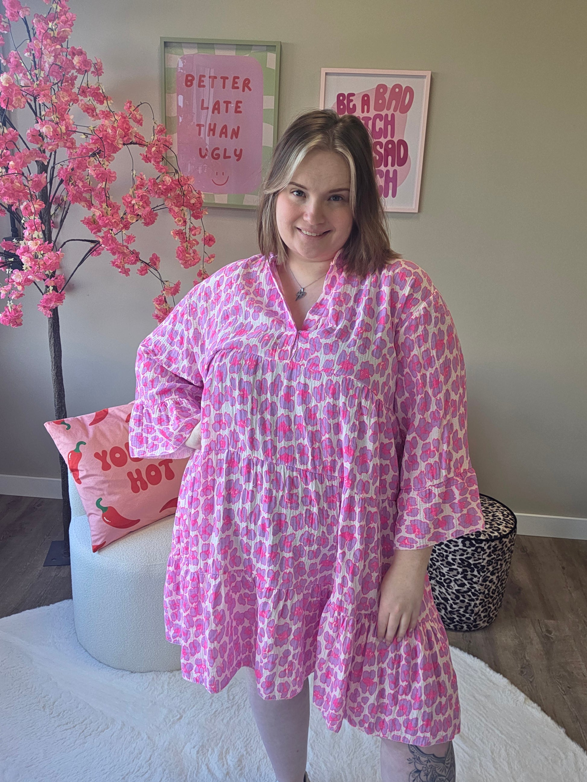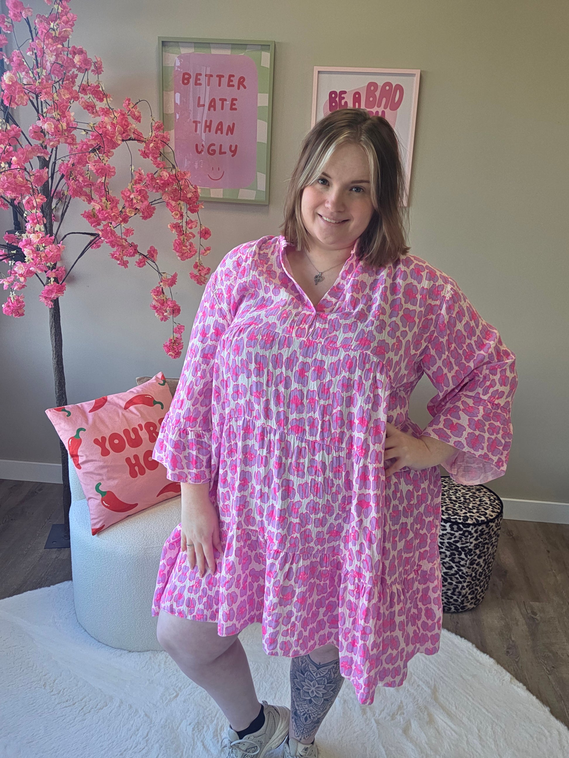Deze panter jurk van 100% katoen is de perfecte mix van stoer en heerlijk draagbaar. De trendy panterprint geeft je outfit een krachtige uitstraling, terwijl het katoen zorgt voor een luchtig en zacht gevoel op de huid.