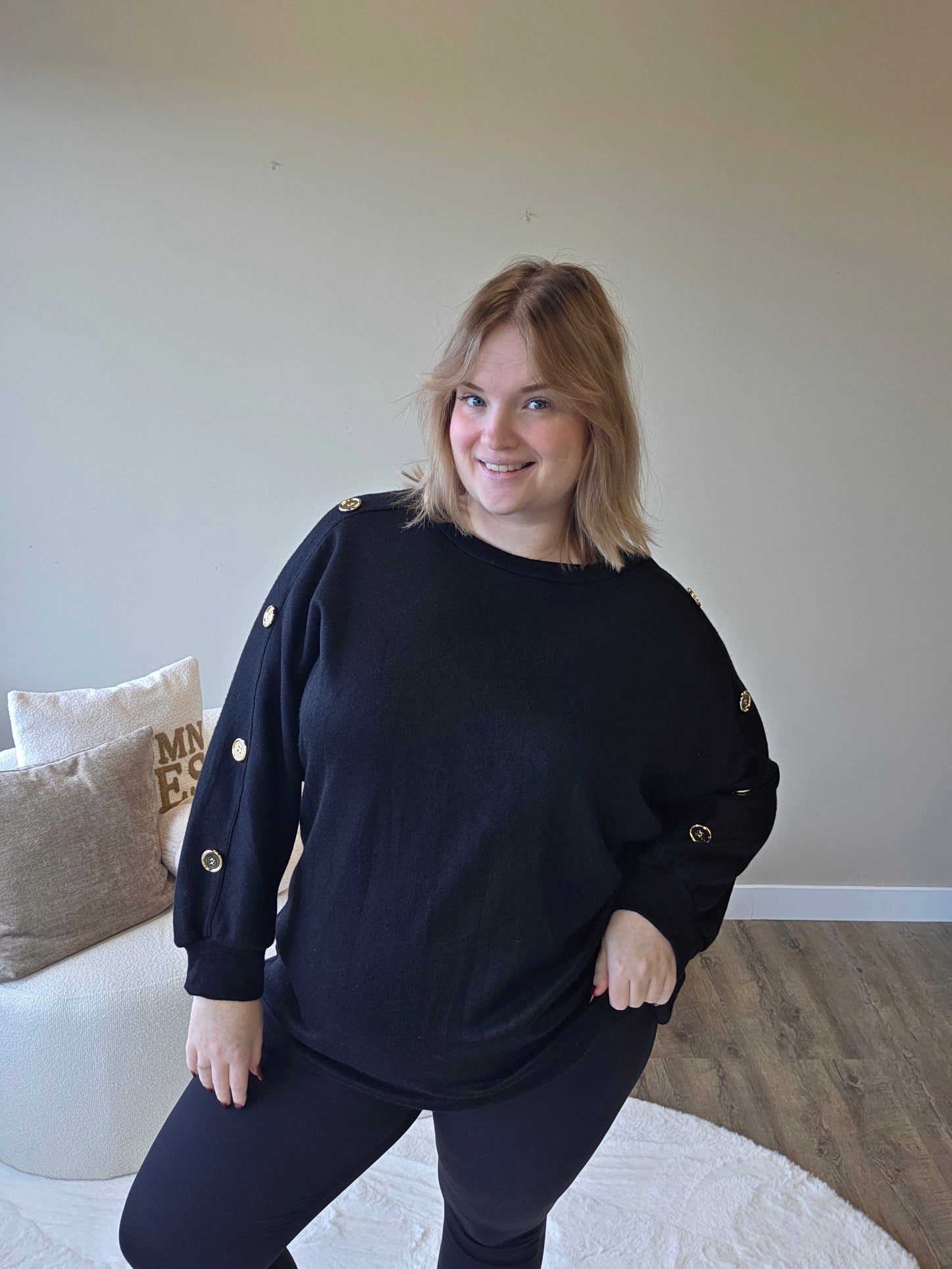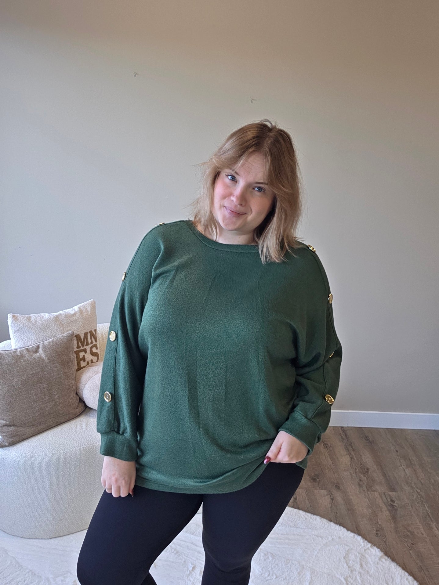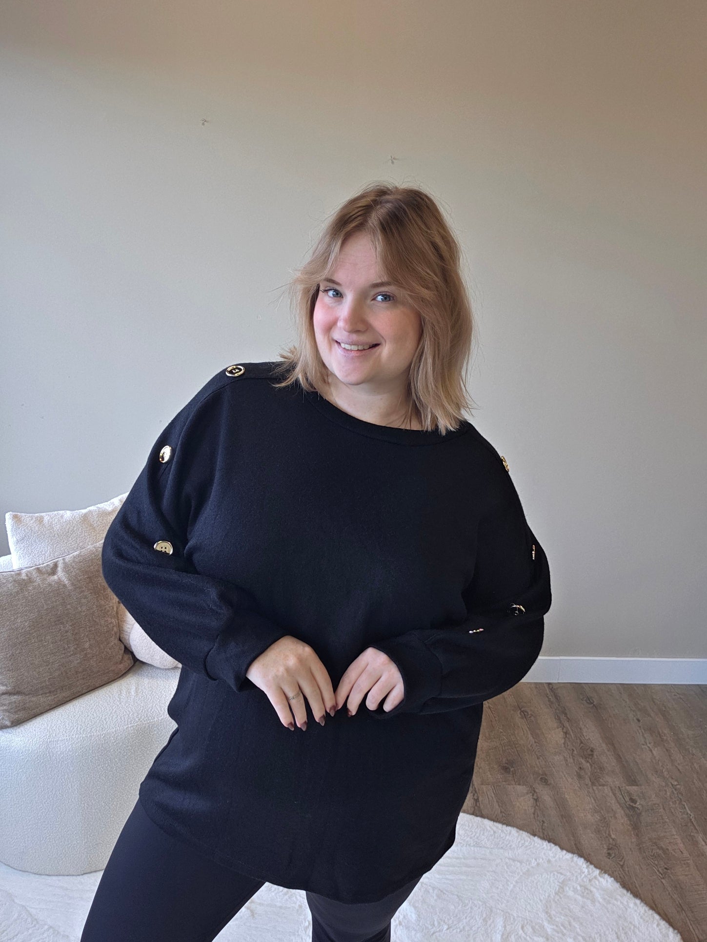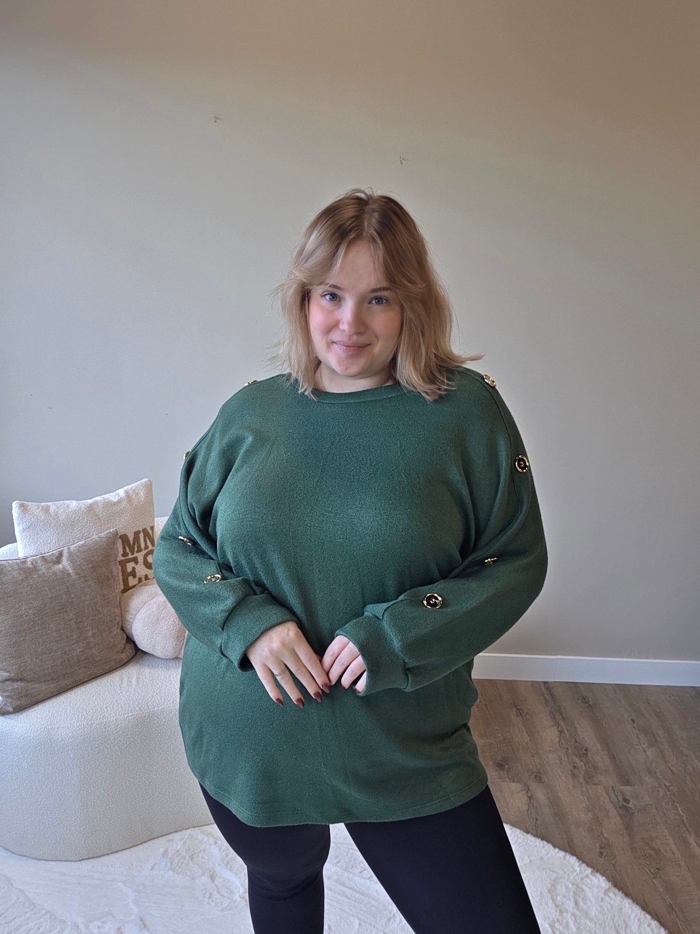 Voeg een vleugje elegantie toe aan je outfit met dit prachtige truitje met gouden knopen op de mouw! De subtiele details geven een luxe uitstraling, terwijl de zachte stof zorgt voor een heerlijk draagcomfort.