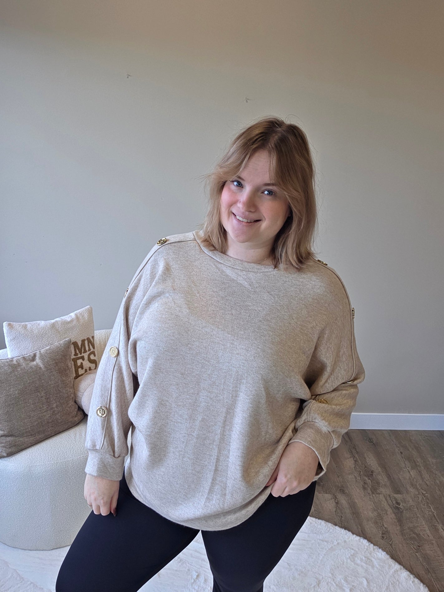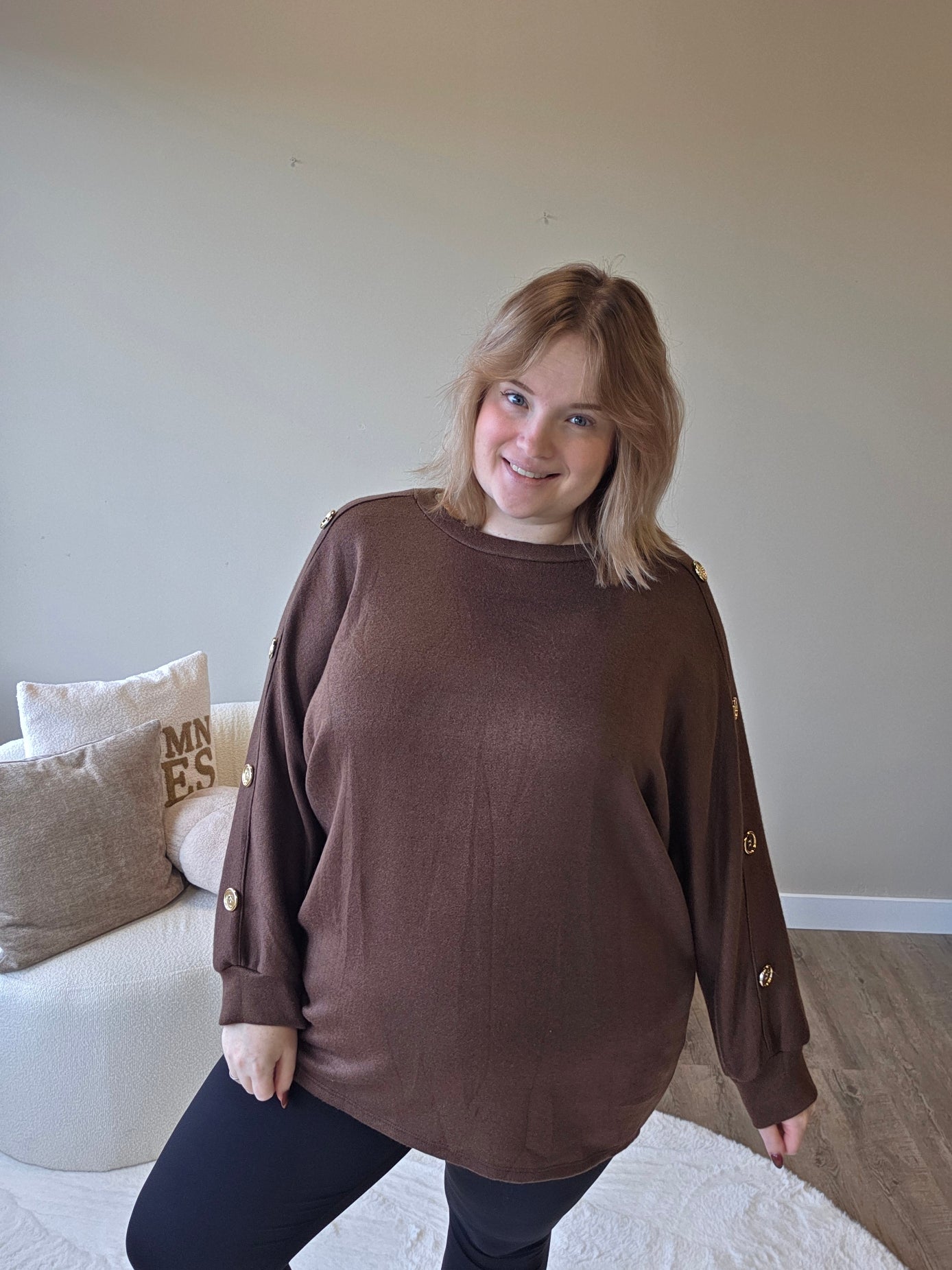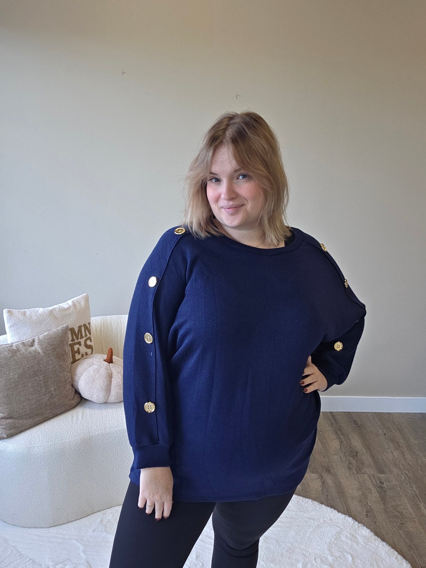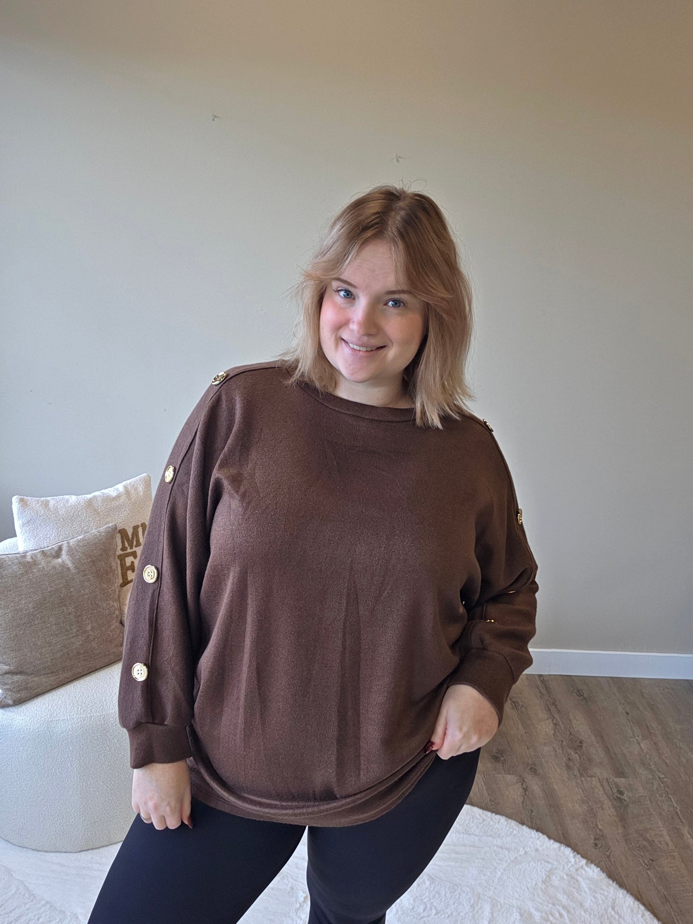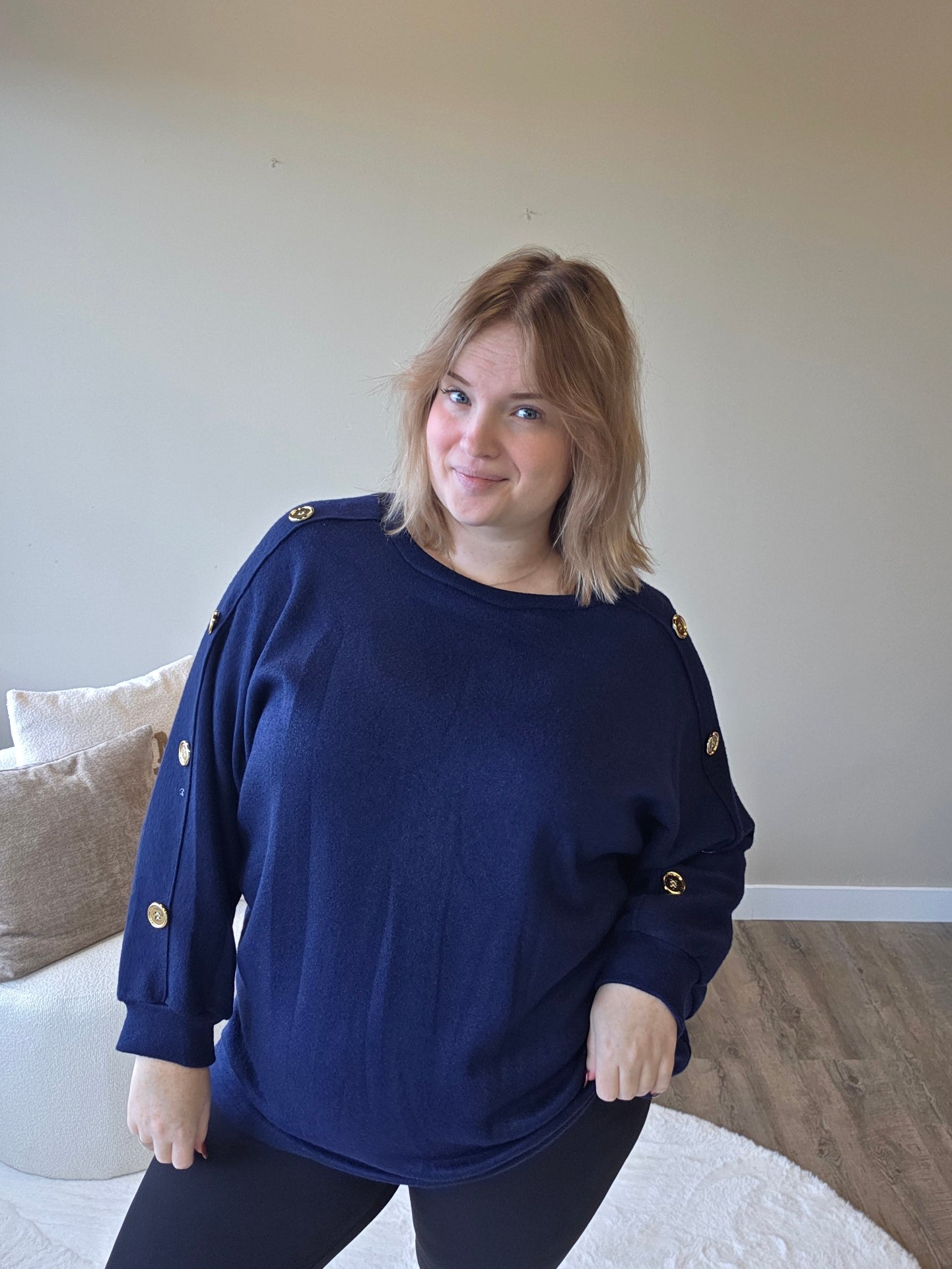 Voeg een vleugje elegantie toe aan je outfit met dit prachtige truitje met gouden knopen op de mouw! De subtiele details geven een luxe uitstraling, terwijl de zachte stof zorgt voor een heerlijk draagcomfort.
