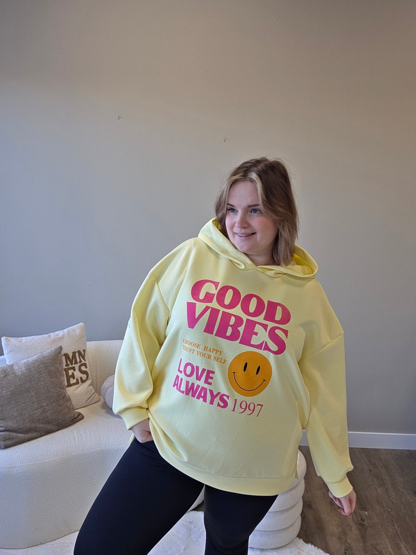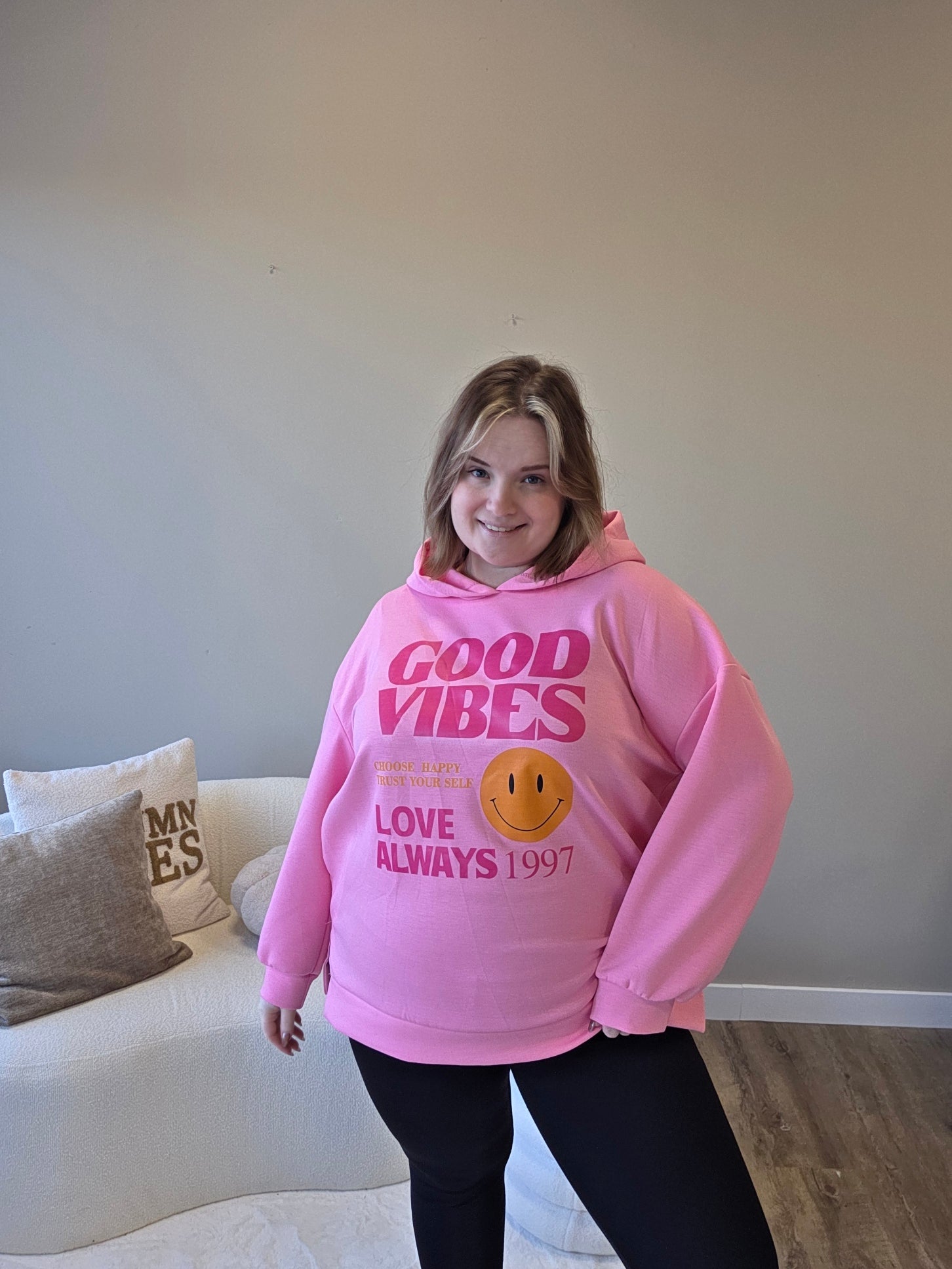 Perfect voor chill days, casual outings of gewoon momenten waarop je jouw positieve energie wilt laten zien. Draag ’m met jeans, joggers of leggings en je bent klaar om de dag in good vibes door te brengen.