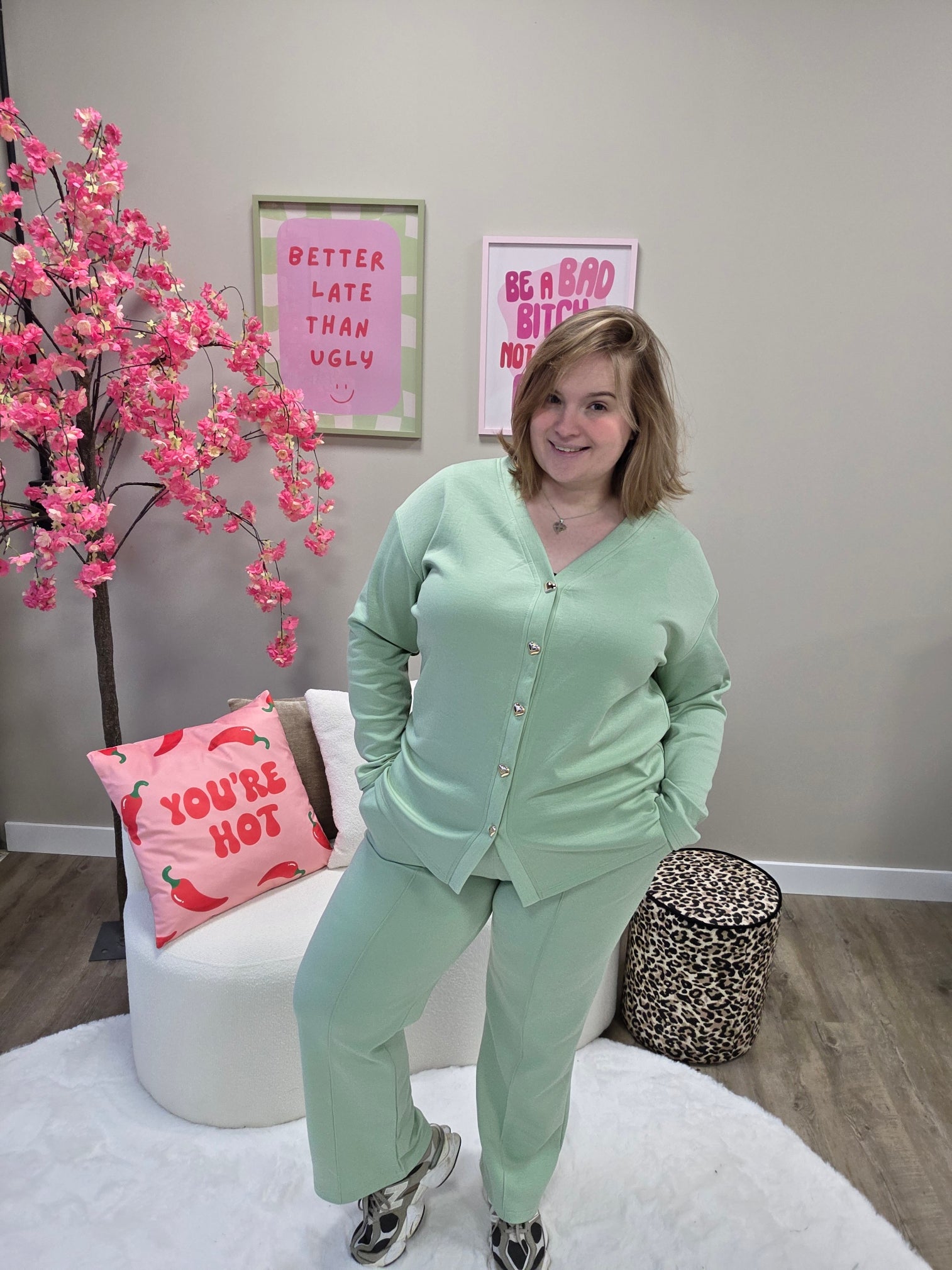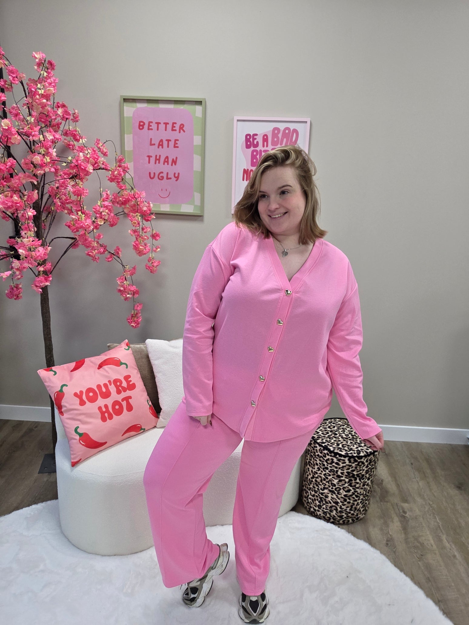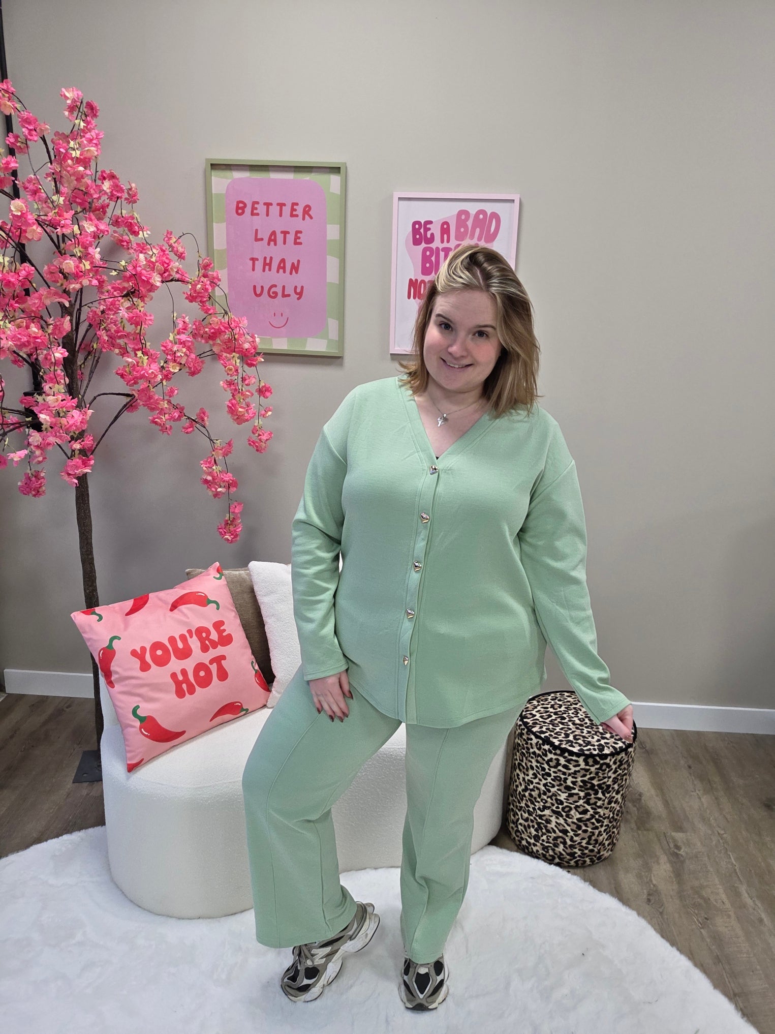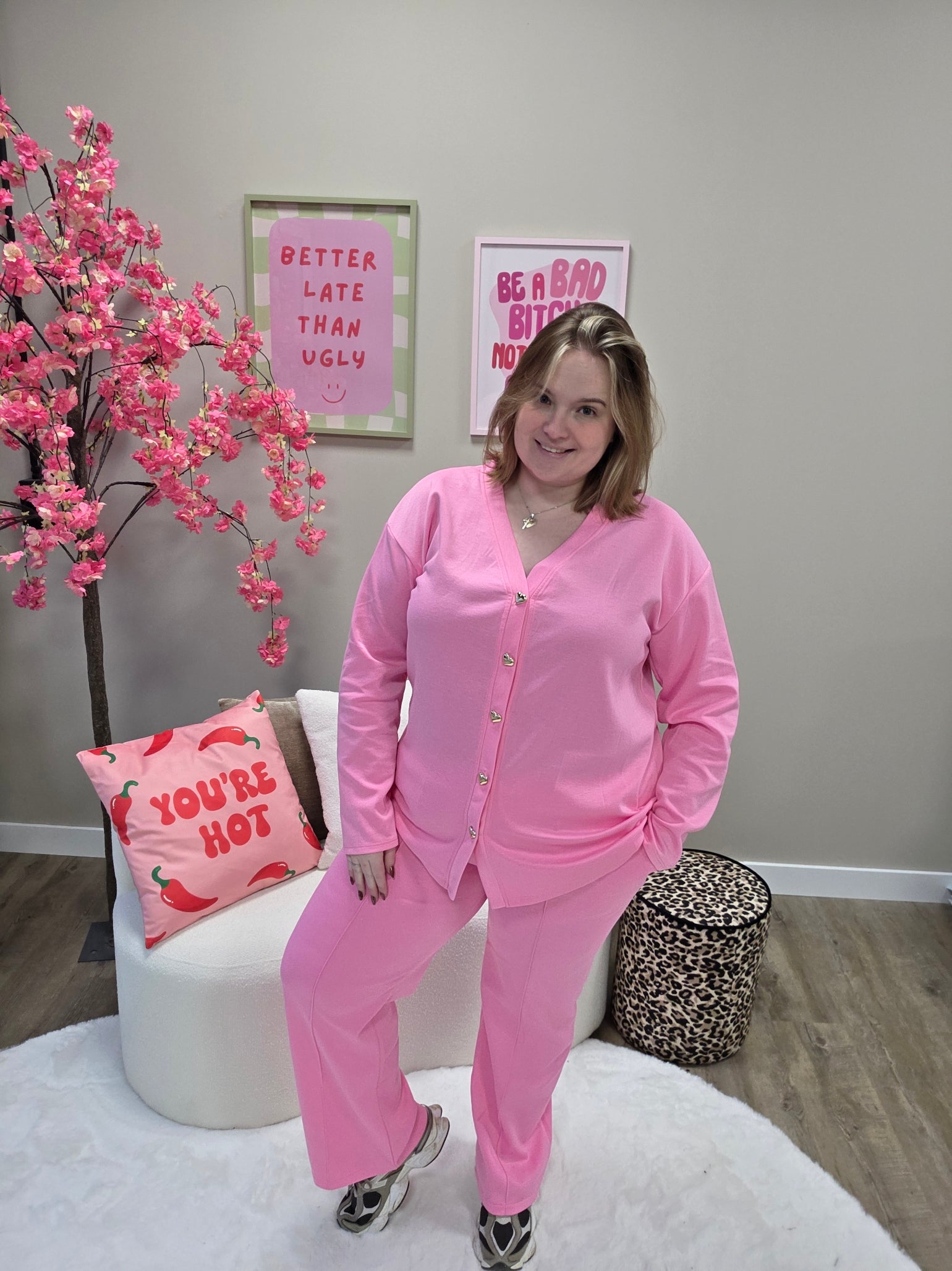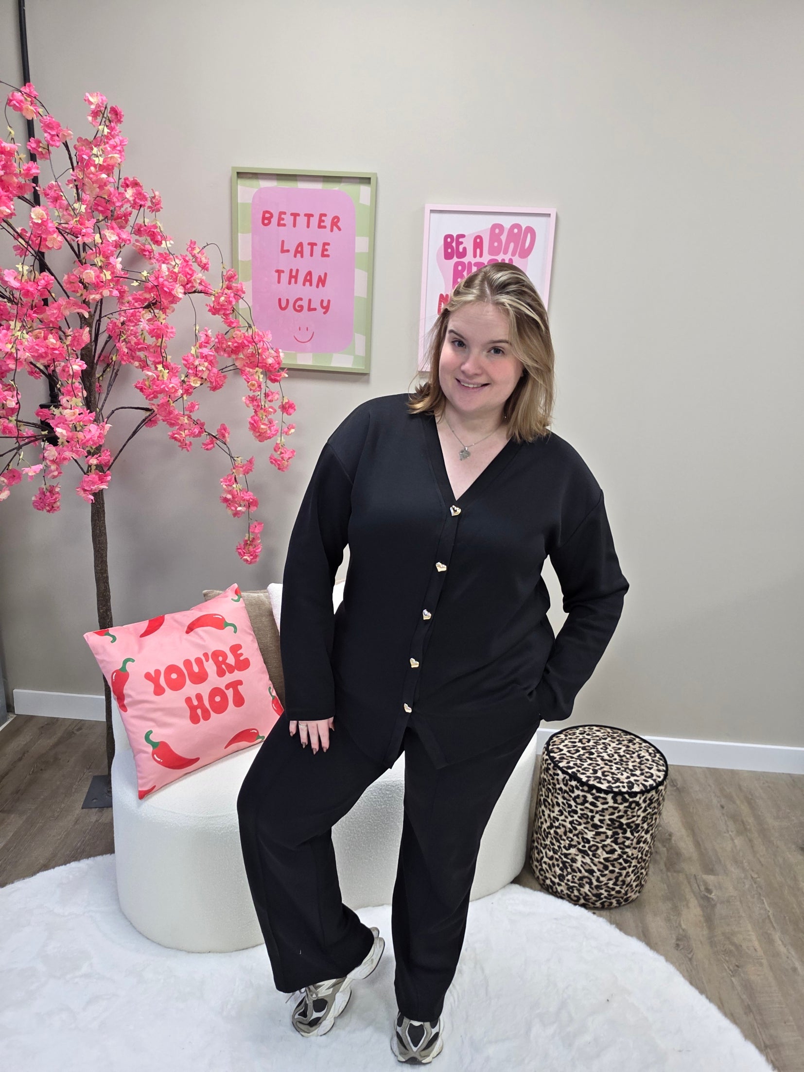 Deze hartjes cardigan set is het ultieme cozy setje met een liefdevolle twist. De zachte stof draagt heerlijk comfortabel, terwijl de schattige hartjesprint zorgt voor een speelse en vrouwelijke uitstraling. Perfect op elkaar afgestemd voor een complete, stijlvolle look.