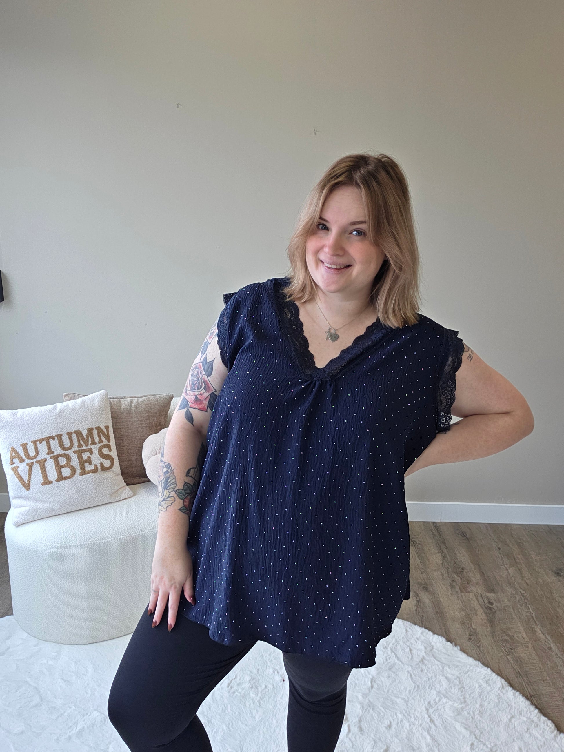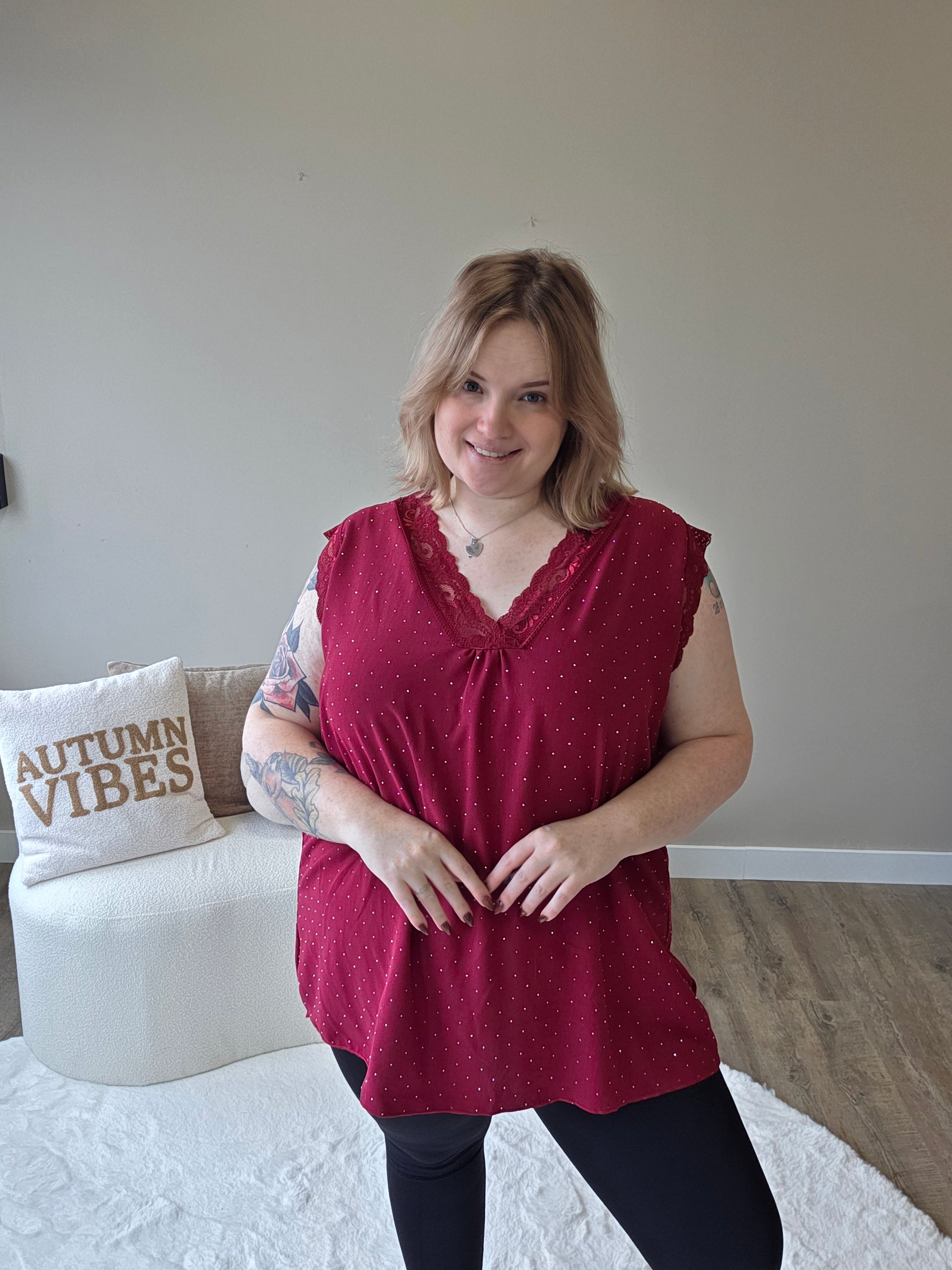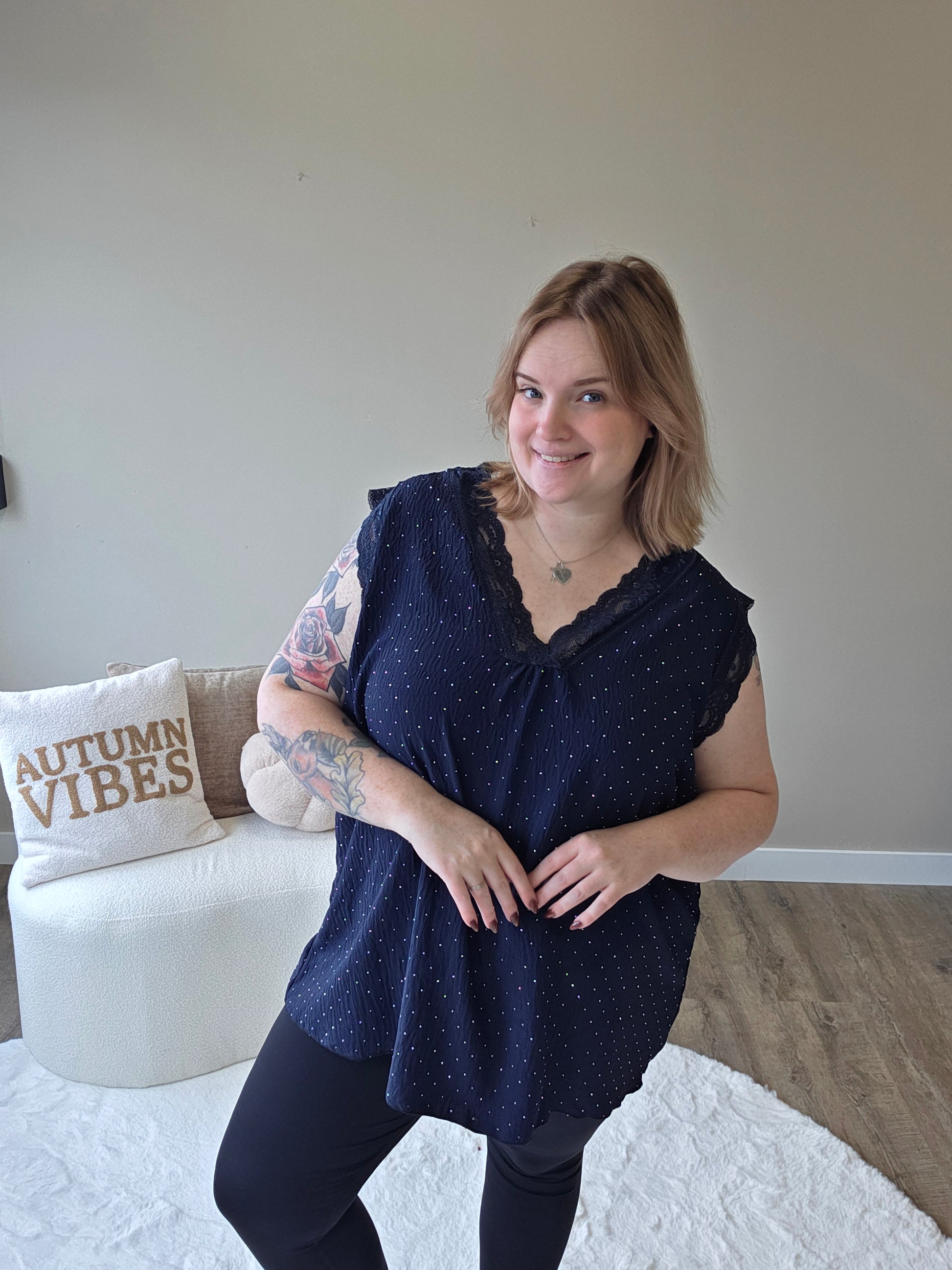 Voeg wat sparkle toe aan je outfit met dit prachtige plussize hemdje! De subtiele strass steentjes vangen het licht bij elke beweging en geven je look een chique, feestelijke touch.